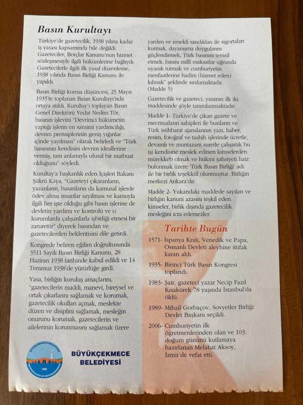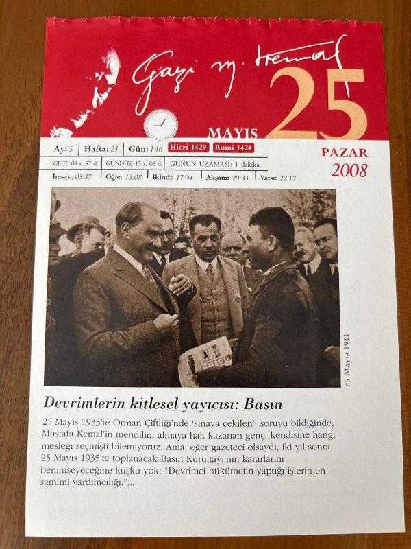 25 MAYIS 2008 - TAKVİM YAPRAĞI - DOĞUM GÜNÜ HEDİYESİ - GAZİ MUSTAFA KEMAL ATATÜRK FOTOĞRAFLI BÜYÜKÇEKMECE BELEDİYESİ TAKVİMİ - Devrimlerin kitlesel yayıcısı: Basın - Basın Kurultayı -1571- İspanya Kralı, Venedik ve Papa, Osmanlı Devleti aleyhine ittifakkararı aldı. 1935- Birinci Türk Basın Kongresi toplandı. - 1983- Şair, gazeteci yazar Necip Fazıl Kısakürek 78 yaşında İstanbul'da öldü - 1989- Mihail Gorbaçov, Sovyetler Birliği Devlet Başkanı seçildi., 3 ay önce satışa sunulmuştur.