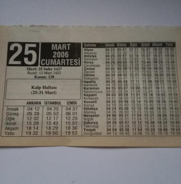 25 Mart 2006-Orijinal Takvim Yaprağı-Doğum Günü-Söz,Nişan,Nikâh,Düğün ve Önemli Günler Hediyesi-ERAŞ Hizmet Takvimi-Ayet-Hadis(Kalp Haftası (25-31 Mart))-Sigara İçmek ve Hamilelik-Bilmeceler-Çocuğunuza İsim:Vahap,Vahide, en son 3 ay önce güncellenmiştir.