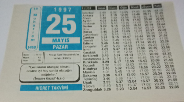 25 Mayıs 1997-Orijinal Takvim Yaprağı-Doğum Günü-Söz,Nişan,Nikâh,Düğün ve Önemli Günler Hediyesi-Hicret Takvimi-Ayet(Hadis)-(İmam-ı Gazali)-Necip Fazıl Kısakürek'in Vefatı(1983)Necip Fazıl Kısakürek-Soru Cevap, en son 23 gün önce güncellenmiştir.