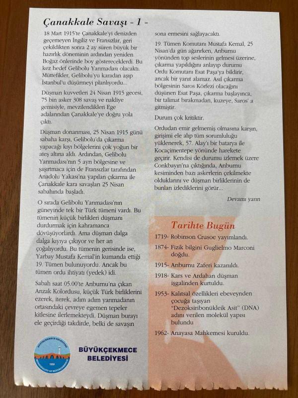 25 NİSAN 2008 - TAKVİM YAPRAĞI - DOĞUM GÜNÜ HEDİYESİ - GAZİ MUSTAFA KEMAL ATATÜRK FOTOĞRAFLI BÜYÜKÇEKMECE BELEDİYESİ TAKVİMİ - Çanakkale'ye çıkartma başladı - Çanakkale Savaşı - 1 - 1719- Robinson Crusoe yayımlandı - 1874- Fizik bilgini Guglielmo Marconi doğdu - 1915- Arıburnu Zaferi kazanıldı - 1918- Kars ve Ardahan düşman işgalinden kurtuldu - 1953- Kalıtsal özellikleri ebeveynden çocuğa taşıyan 'Dezoksiribonükleik Asit" (DNA) adını verilen molekül yapısı bulundu - 1962- Anayasa Mahkemesi kuruldu başlıklı ürün, Efemera, Müzik, Sinema > Belge ve Evraklar > Takvimler kategorisi altında İkinci El olarak satılmaktadır.