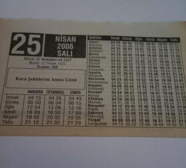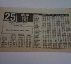 25 Nisan 2006-Orijinal Takvim Yaprağı-Doğum Günü-Söz,Nişan,Nikâh,Düğün ve Önemli Günler Hediyesi-ERAŞ Hizmet Takvimi-Ayet-Hadis(Kara Şehitlerini Anma Günü)-Alışverişte Görülmeyen Haramlar-Saçlarına Bir Şey Olmamış-Çocuğunuza İsim:Osman,Selcen, en son 3 ay önce güncellenmiştir.