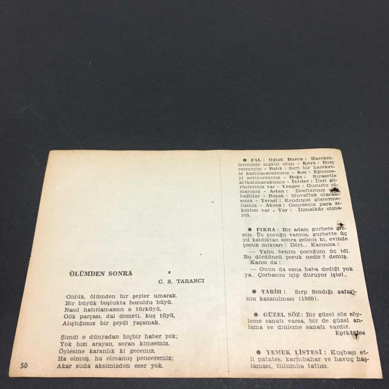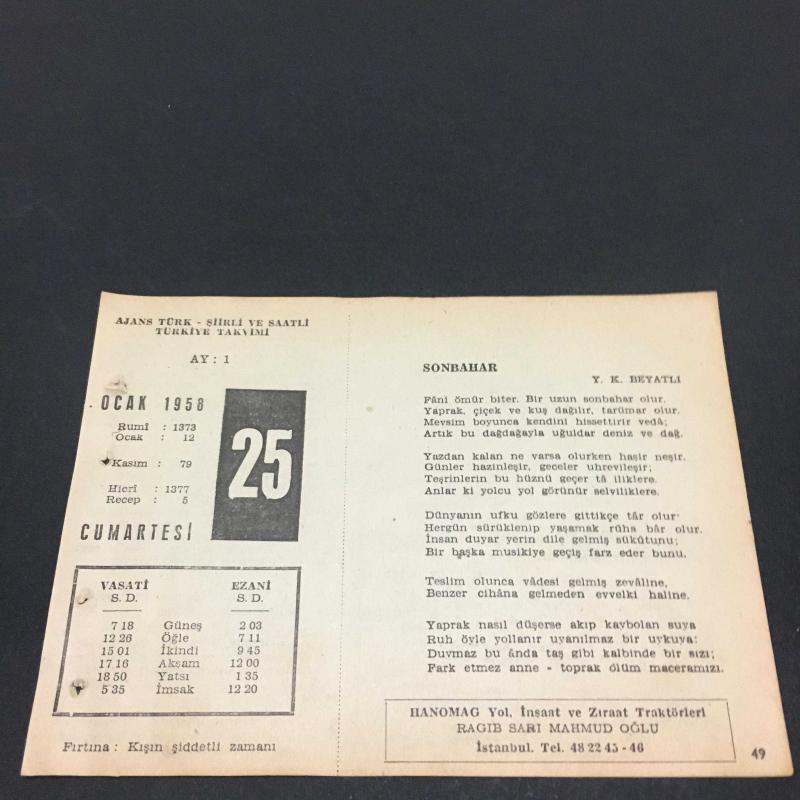 25 OCAK 1958-TAKVİM YAPRAĞI-DOĞUM GÜNÜ HEDİYESİ-AJANS TÜRK-ŞİİRLİ VE SAATLİ TÜRKİYE TAKVİMİ,Y.K.BEYATLI,C.S TARANCI,FAL,FIKRA,SIRP SINDIĞI ZAFERİNİN KAZANILMASI,1369,GÜZEL SÖZ,YEMEK LİSTESİ,, en son 8 ay önce güncellenmiştir.