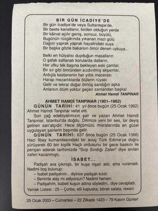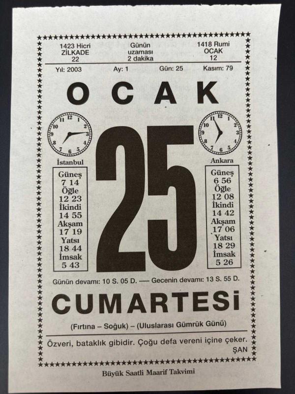 25 OCAK 2003 - TAKVİM YAPRAĞI - DOĞUM GÜNÜ HEDİYESİ - BÜYÜK SAATLİ MAARİF TAKVİMİ - ŞAN - AHMET HAMDİ TANPINAR - AHMET HAMDİ TANPINAR'IN VEFATI - SIRP SINDIĞI ZAFERİ - İSABET, 7 ay önce satışa sunulmuştur.
