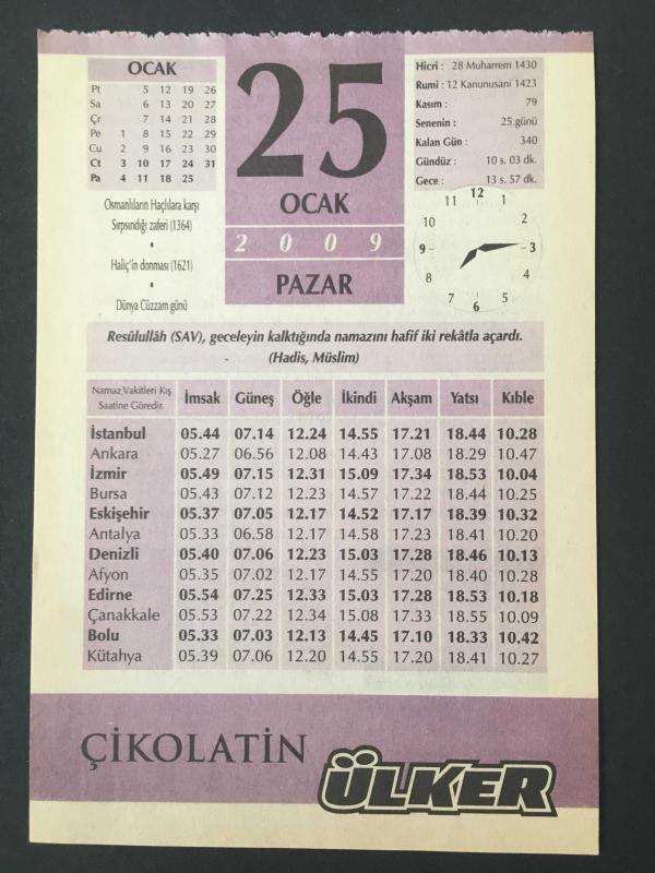 25 OCAK 2009 -TAKVİM YAPRAĞI-DOĞUM GÜNÜ HEDİYESİ-ÜLKER TAKVİMİ,SIRPSINDIĞI ZAFERİ 1364,HALİÇİN DONMASI 1621,DÜNYA CÜZZAM GÜNÜ,BİZ NE YAPABİLİRİZ EVDE,ÇOK CESURMUŞ,GÜNÜN MENÜSÜ,ÇOCUĞUNUZUN İSMİ,CEVİZ İLE GELEN SAĞLIK başlıklı ürün, Efemera, Müzik, Sinema > Belge ve Evraklar > Takvimler kategorisi altında İkinci El olarak satılmaktadır.