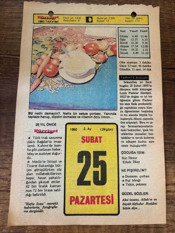 25 ŞUBAT 1980 - TAKVİM YAPRAĞI - DOĞUM GÜNÜ HEDİYESİ - HÜRRİYET TAKVİMİ - VASİYETNAME ADLI ROMAN - Aktör Raşit Rıza Samoko'nun ölümü (1961) - Çoruh ilimizin Artvin adını alışı (1950), 6 ay önce satışa sunulmuştur.