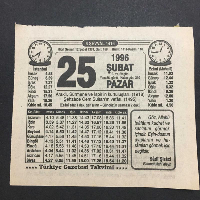 25 ŞUBAT 1996 -TAKVİM YAPRAĞI-DOĞUM GÜNÜ HEDİYESİ-TÜRKİYE GAZETESİ TAKVİMİ,ARAKLI SÜRMENE VE İSPİRİN KURTULUŞLARI,1918,CEM SULTANIN VEFATI 1495,ANADOLU ÇİÇEĞİ,UZUN ÖMÜR başlıklı ürün, Efemera, Müzik, Sinema > Belge ve Evraklar > Takvimler kategorisi altında İkinci El olarak satılmaktadır.