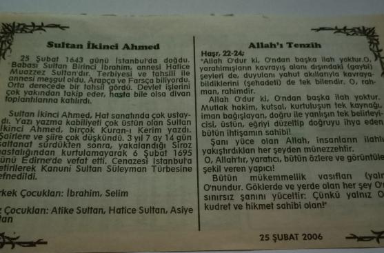 25 Şubat 2006-Orijinal Takvim Yaprağı-Doğum Günü-Söz,Nişan,Nikâh,Düğün ve Önemli Günler Hediyesi-Bizim Anadolu Takvimleri-Ayet-Hadis(Zilzal Suresi,7-8)(Malcom X ABD'de şehid edildi(1965))-Asım,Hediye-Sultan İkinci Ahmed-Allah'ı Tenzih başlıklı ürün, Efemera, Müzik, Sinema > Belge ve Evraklar > Takvimler kategorisi altında İkinci El olarak satılmaktadır.