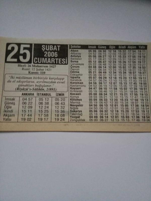 25 Şubat 2006-Orijinal Takvim Yaprağı-Doğum Günü-Söz,Nişan,Nikâh,Düğün ve Önemli Günler Hediyesi-ERAŞ Hizmet Takvimi-Ayet-Hadis(Riyâzü's-Sâlihîn,2/891)-Kehanet ve Falcılık-Güzel Sözler-Uyur Gezer-Çocuğunuza İsim:Umut,Ülfet, en son 3 ay önce güncellenmiştir.