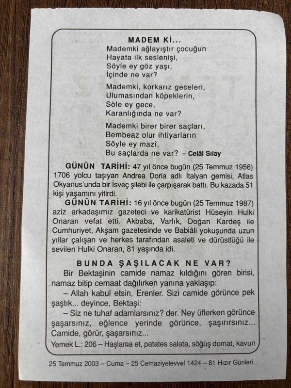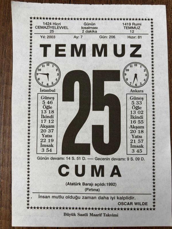 25 TEMMUZ 2003 - TAKVİM YAPRAĞI - DOĞUM GÜNÜ HEDİYESİ - BÜYÜK SAATLİ MAARİF TAKVİMİ - OSCAR WİLDE - CELAL SILAY - 1706 UOLCU TAŞIYAN ADREA DORİA ADLI GEMİ OKYANUS'DA KAZA YAPARAK BATTI - GAZETECİ VE KARİKATÜRİST HULKİ ONARAN'IN VEFATI - BUNDA ŞAŞILACAK NE VAR, en son 8 ay önce güncellenmiştir.