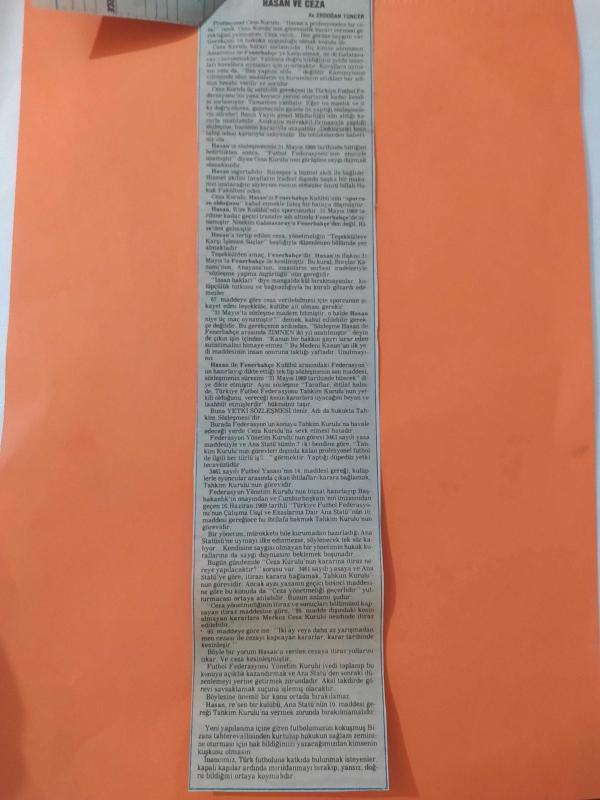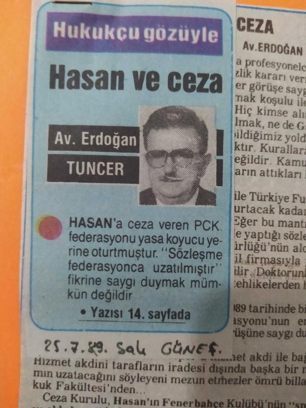 Kitap 1989 yılında yayınlanmıştır. 25 Temmuz 1989 - Güneş Gazetesi - Hasan ve ceza - Erdoğan Tuncer - Profesyonel Ceza Kurulu, ''Hasan'a profesyonelce bir ceza!'' verdi. Ceza Kurulu'nun görevsizlik kararı vermesi gerektiğini yazmıştım. Ceza verdi... - Gazete tam değil kupürüdür - 8x34cm ebatındadır.. adlı eser Türkçe dilindedir.