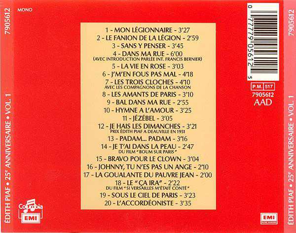 25e Anniversaire - Volume 1 - Edith Piaf Audio CD EMI Pathé Marconi – 7905612 1988 France