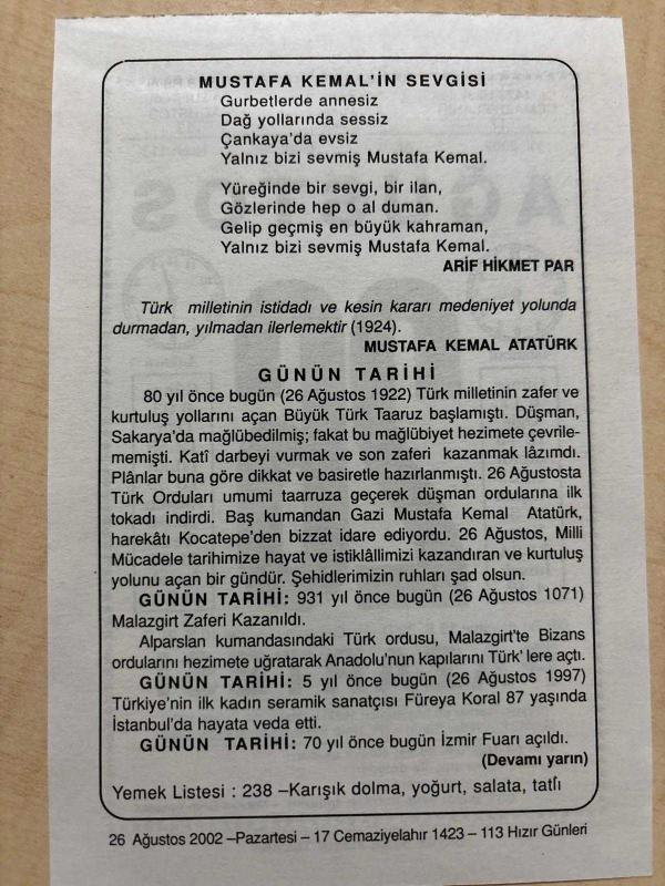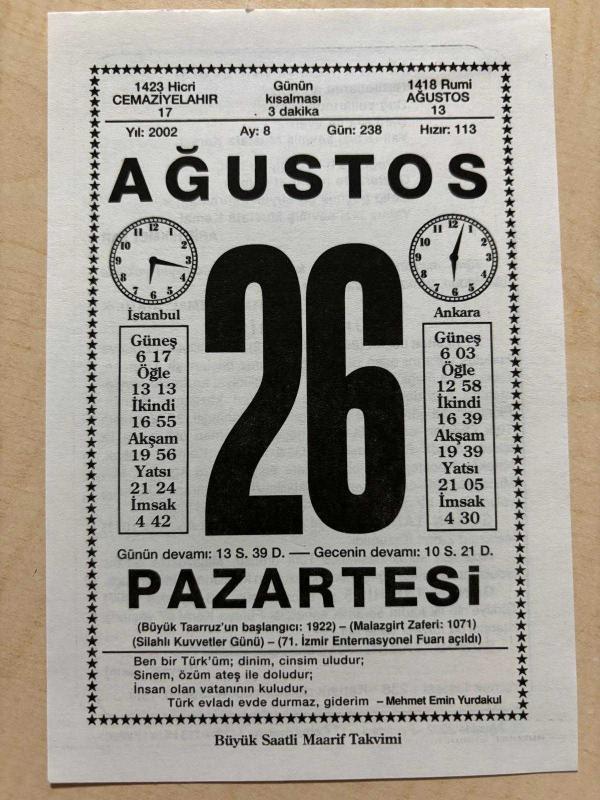 26 AĞUSTOS 2002 - TAKVİM YAPRAĞI - DOĞUM GÜNÜ HEDİYESİ - BÜYÜK SAATLİ MAARİF TAKVİMİ - MEHMET EMİN YURDAKUL - ARİF HİKMET PAR - MUSATAFA KEMAL ATATÜRK - BÜYÜK TAARRUZ'UN BAŞLANGICI - MALAZGİRT ZAFERİ KAZANILDI - TÜRKİYE'NİN İLK SEERAMİK SANATÇISI FÜREYA KORAL VEFAT ETTİ - İZMİR FUARI AÇILDI, en son 8 ay önce güncellenmiştir.