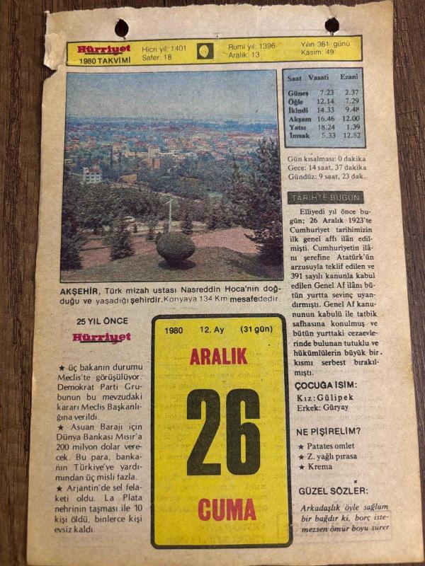 26 ARALIK 1980 - TAKVİM YAPRAĞI - DOĞUM GÜNÜ HEDİYESİ - HÜRRİYET TAKVİMİ - ESKİ BİR ŞARKI ADLI ROMAN - Uluslararası takvim ve saatin kabulü (1925), 5 ay önce satışa sunulmuştur.