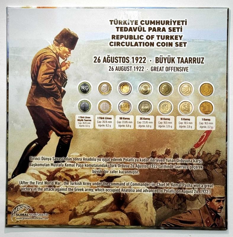 T.C. Darphane ve Damga Matbaası Genel Müdürlüğü tarafından hazırlanan bu özel tedavül para seti, 26 Ağustos 1922 Büyük Taarruz anısına tasarlanmıştır. Set tasarımında Gazi Mustafa Kemal Atatürk ve Büyük Taarruz temalı görseller yer almakta olup tarihî bir kompozisyonla sunulmuştur. Set içerisinde 1 Türk Lirası Büyük Taarruz hatıra para ile birlikte 1 TL, 50 Kuruş, 25 Kuruş, 10 Kuruş, 5 Kuruş ve 1 Kuruş tedavül paraları yer almaktadır. Paralar çil kondisyondadır ve özel tasarım karton ambalajı içerisinde muhafaza edilmektedir. Milli Mücadele tarihimizin en önemli dönüm noktalarından biri olan Büyük Taarruz’u konu alan bu set, hem tarihî anlamı hem de koleksiyon değeri açısından öne çıkmaktadır. Fotoğraflar ürünün birebir kendisine aittir. Basım Yılı: 2022 Tema: 26 Ağustos 1922 Büyük Taarruz