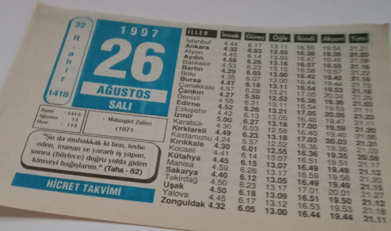 26 Ağustos 1997-Orijinal Takvim Yaprağı-Doğum Günü-Söz,Nişan,Nikâh,Düğün ve Önemli Günler Hediyesi-Hicret Takvimi-Ayet(Hadis)-(Taha-82)-Malazgirt Zaferi(1071)-İmam-ı Rabbani-Soru Cevap-Honore De Balsac, en son 3 gün önce güncellenmiştir.