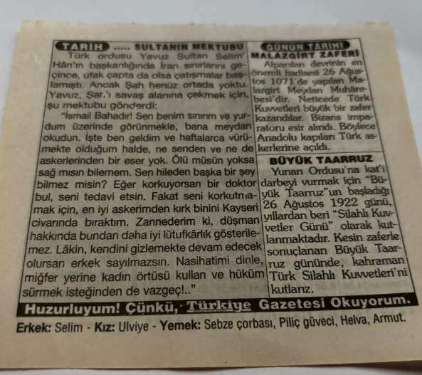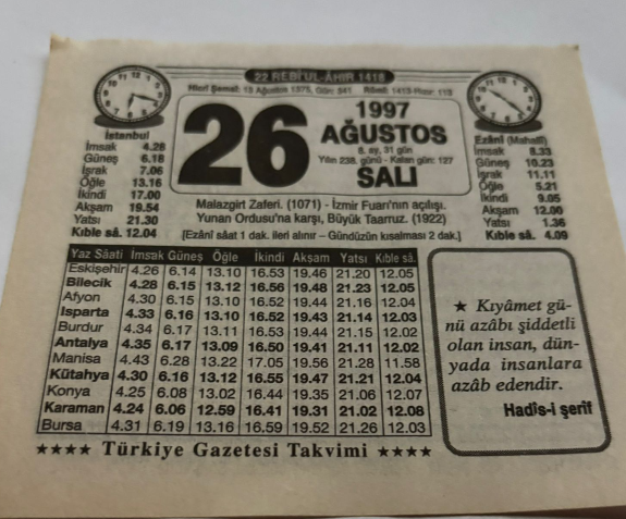 26 Ağustos 1997-Orijinal Takvim Yaprağı-Doğum Günü-Söz,Nişan,Nikâh,Düğün ve Önemli Günler Hediyesi-Türkiye Gazetesi Takvimi-Ayet,Hadis (Hadis-i Şerif)-Yunan Ordusu'na karşı,Büyük Taarruz(1922)-Sultanın Mektubu-Malazgirt Zaferi-Büyük Taarruz-Erkek:Selim,Kız:Ulviye, en son 2 gün önce güncellenmiştir.