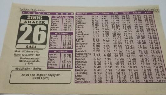 26 Aralık 2006-Orijinal Takvim Yaprağı-Doğum Günü-Söz,Nişan,Nikâh,Düğün ve Önemli Günler Hediyesi-Bizim Anadolu Takvimleri-Ayet(Hadis-i Şerif)-Uluslararası saat takviminin kabulü(1926)-Abdulhalim,Belkis-Dua'nın Ağırlığı, en son 2 ay önce güncellenmiştir.