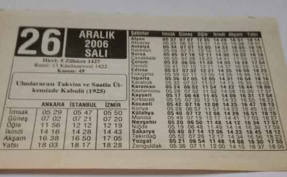 26 Aralık 2006-Orijinal Takvim Yaprağı-Doğum Günü-Söz,Nişan,Nikâh,Düğün ve Önemli Günler Hediyesi-ERAŞ Hizmet Takvimi-Ayet-Hadis(Uluslararası Takvim ve Saatin Ülkemizde Kabulü (1925))-Kurban-Çocuğunuza İsim:Feridun,Ferda, en son 3 ay önce güncellenmiştir.