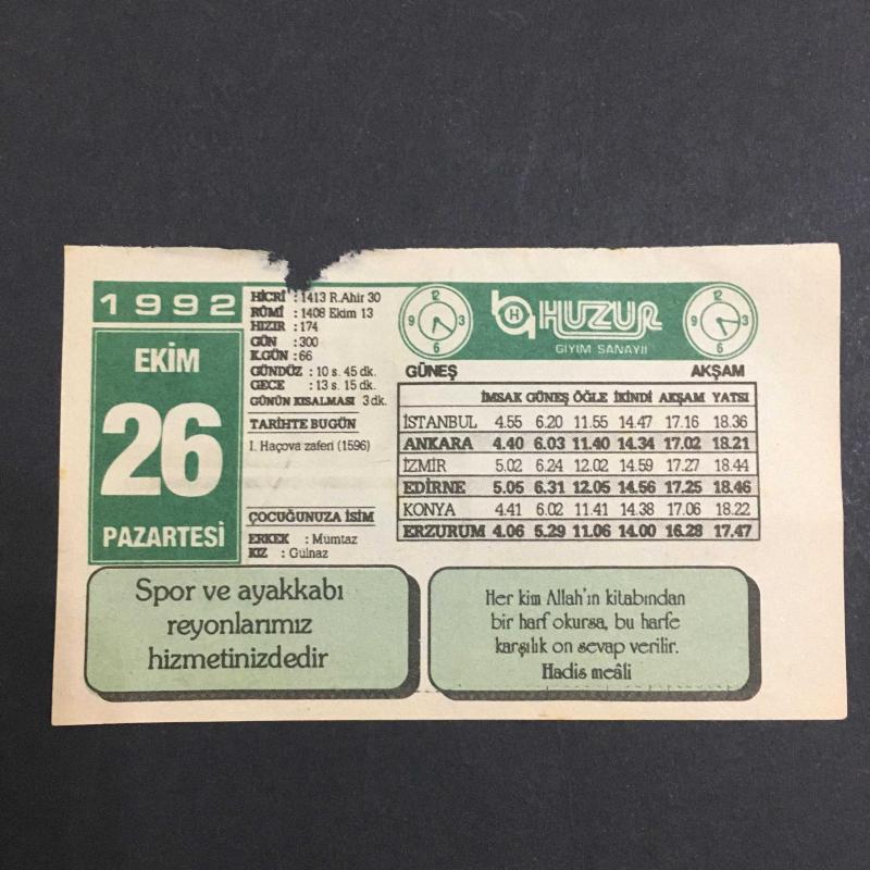 26 EKİM 1992 -TAKVİM YAPRAĞI-DOĞUM GÜNÜ HEDİYESİ-HUZUR TAKVİMİ,1.HAÇOVA ZAFERİ 1596,ÇOCUĞUNUZA İSİM,KOMŞULUK BORCU,GÜZEL KONUŞMAK başlıklı ürün, Efemera, Müzik, Sinema > Belge ve Evraklar > Takvimler kategorisi altında İkinci El olarak satılmaktadır.