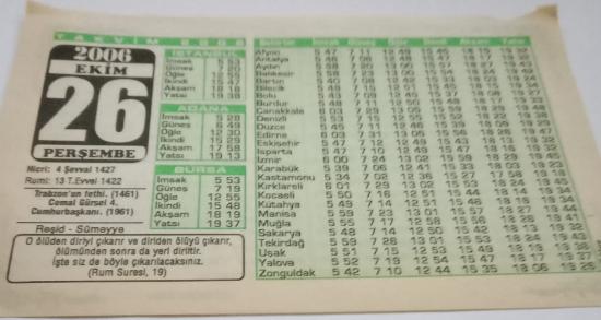 26 Ekim 2006-Orijinal Takvim Yaprağı-Doğum Günü-Söz,Nişan,Nikâh,Düğün ve Önemli Günler Hediyesi-Bizim Anadolu Takvimleri-Ayet(Rum Suresi:19)-Trabzon'un Fethi(1461)-Reşid,Sümeyye-İşte O Allah'tır-I, en son bir ay önce güncellenmiştir.