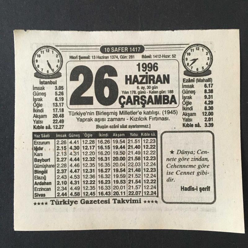 26 HAZİRAN 1996 -TAKVİM YAPRAĞI-DOĞUM GÜNÜ HEDİYESİ-TÜRKİYE GAZETESİ TAKVİMİ,TÜRKİYENİN BİRLEŞMİŞ MİLLETLERE KATILIŞI 1945,YAPRAK AŞISI ZAMANI,KIZILCIK FIRTINASI,MEHTER, başlıklı ürün, Efemera, Müzik, Sinema > Belge ve Evraklar > Takvimler kategorisi altında İkinci El olarak satılmaktadır.