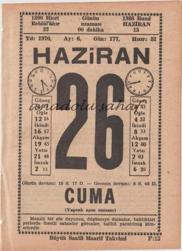 26 Haziran 1970 / Büyük Saatli Maarif Takvimi