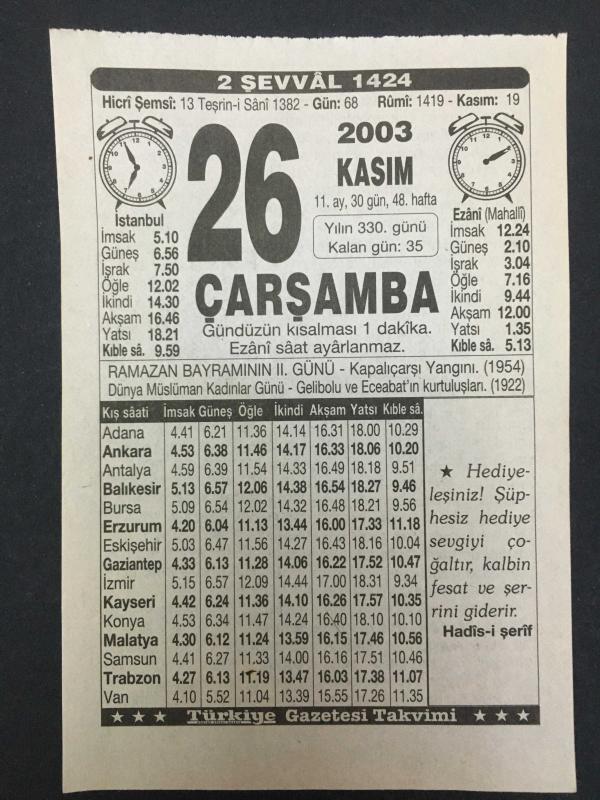 26 KASIM 2003-TAKVİM YAPRAĞI-DOĞUM GÜNÜ HEDİYESİ-TÜRKİYE GAZETESİ TAKVİMİ,KAPALIÇARŞI YANGINI,1954,DÜNYA MÜSLÜMAN KADINLAR GÜNÜ ,GELİBOLU VE ECEABATIN KURTULUŞLARI 1922,BAYRAM GÜNLERİ, en son 8 ay önce güncellenmiştir.