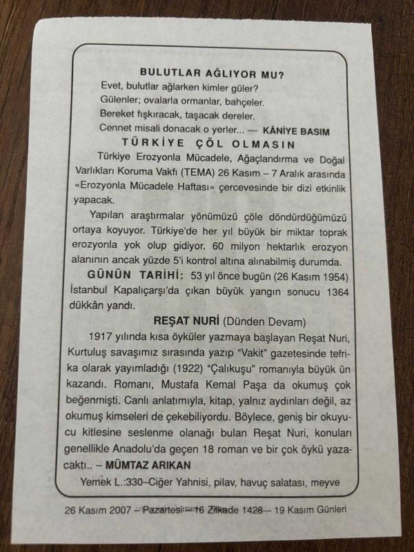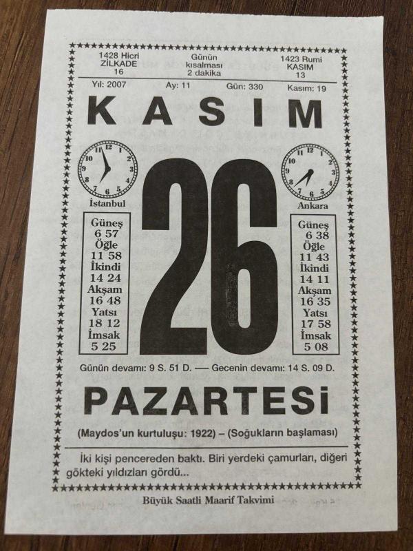 26 KASIM 2007 - TAKVİM YAPRAĞI - DOĞUM GÜNÜ HEDİYESİ - BÜYÜK SAATLİ MAARİF TAKVİMİ - KANİYE BASIM - TÜRKİYE ÇÖL OLMASIN - BÜYÜK İSTANBUL KAPALIÇARŞI YANGINI - REŞAT NURİ - MÜMTAZ ARIKAN, en son 8 ay önce güncellenmiştir.