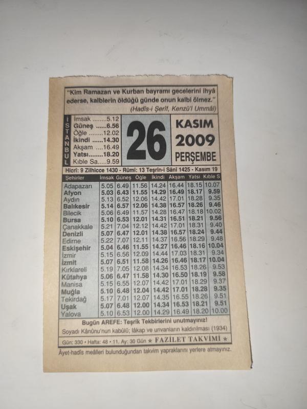 26 Kasım 2009-Orijinal Takvim Yaprağı-Doğum Günü-Söz,Nişan,Nikâh,Düğün ve Önemli Günler Hediyesi-Fazilet Takvimi-Ayet(Hadis)(Hadis-i Şerif, Kenzü'l Ummal)-Bugün AREFE: Teşrik Tekbirlerini Unutmayınız! Soyadı Kanunu'nun kabulü: lakap ve unvanların kaldırılması (1934)-Bayram Namazı Nasıl Kılınır?- Arefe Ve Bayram Geceleri Ne yapmalı? başlıklı ürün, Efemera, Müzik, Sinema > Belge ve Evraklar > Takvimler kategorisi altında İkinci El olarak satılmaktadır.