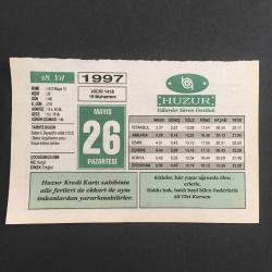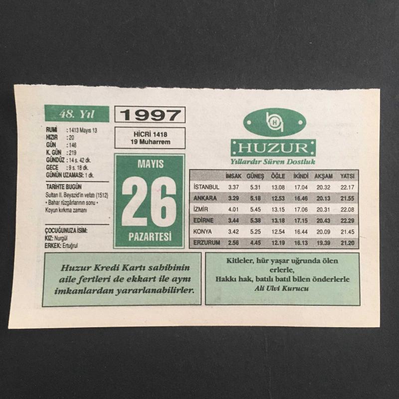 26 MAYIS 1997 -TAKVİM YAPRAĞI-DOĞUM GÜNÜ HEDİYESİ-HUZUR TAKVİMİ,2.BEYAZITIN VEFATI 1512,BAHAR RÜZGARLARININ SONU,KOYUN KIRPMA ZAMANI,ÇOCUĞUNUZA İSİM,NEFSİMİZE HAKİM OLMALIYIZ,NASIL ÇALIŞMALI, en son 8 ay önce güncellenmiştir.