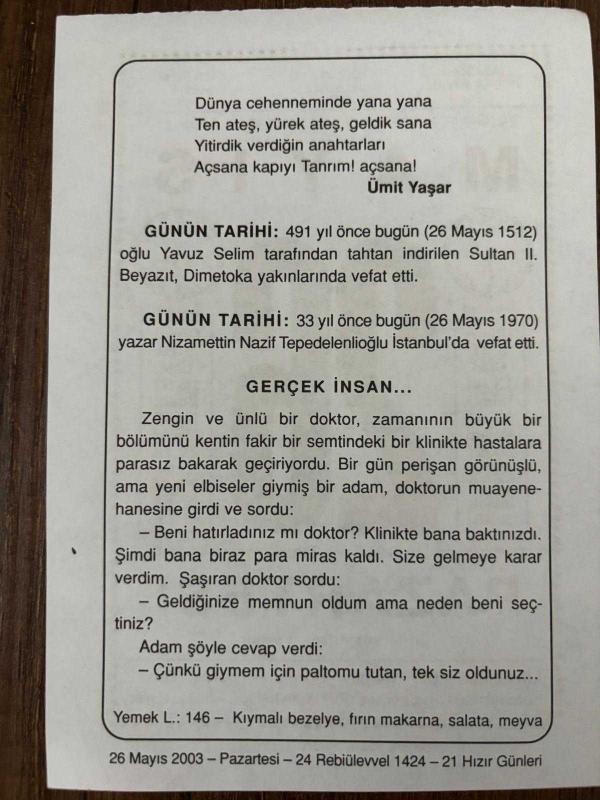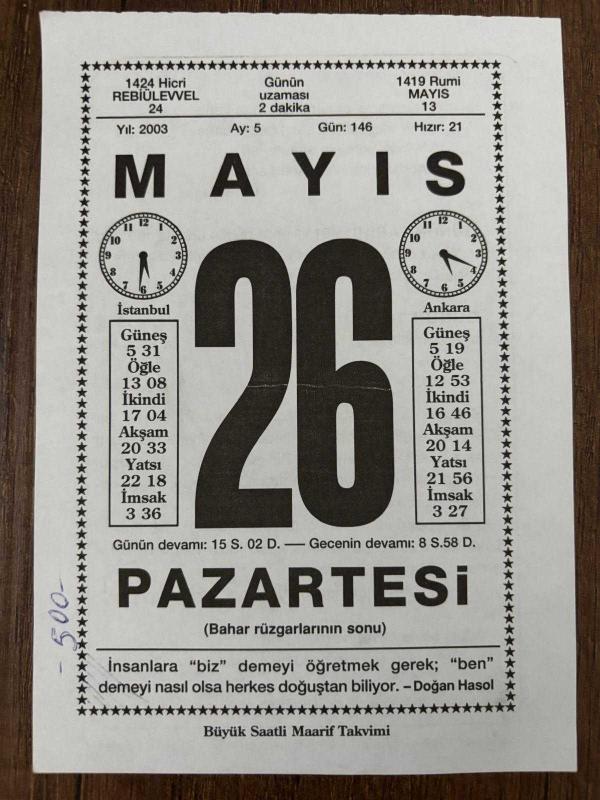 26 MAYIS 2003 - TAKVİM YAPRAĞI - DOĞUM GÜNÜ HEDİYESİ - BÜYÜK SAATLİ MAARİF TAKVİMİ - DOĞAN HASOL - ÜMİT YAŞAR - SULTAN II.BEYAZIT'IN VEFATI - YAZAR NİZAMETTİN NAZİF TEPEDELENLİOĞLU'NUN VEFATI - GERÇEK İNSAN, en son 8 ay önce güncellenmiştir.