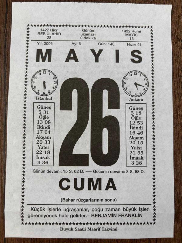 26 MAYIS 2006 - TAKVİM YAPRAĞI - DOĞUM GÜNÜ HEDİYESİ - BÜYÜK SAATLİ MAARİF TAKVİMİ - BENJAMİN FRANKLİN - HÜSEYİN RİFAT - SULTAN II.BEYAZIT'IN VEFATI - YAZAR NİZAMETTİN NAZİF TEPEDELENLİOĞLU'NUN VEFATI, en son 8 ay önce güncellenmiştir.