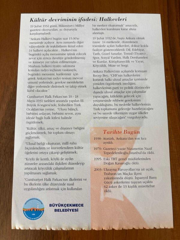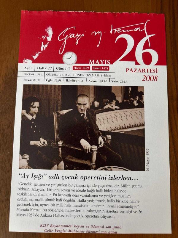 26 MAYIS 2008 - TAKVİM YAPRAĞI - DOĞUM GÜNÜ HEDİYESİ - GAZİ MUSTAFA KEMAL ATATÜRK FOTOĞRAFLI BÜYÜKÇEKMECE BELEDİYESİ TAKVİMİ - "Ay Işığı" adlı çocuk operetini izlerken - Kültür devriminin ifadesi: Halkevleri - 1938- Atatürk, Ankara'dan son kez ayrıldı 1970- Gazeteci yazar Nizamettin Nazif Tepedelenlioğlu,İstanbul'da öldü.-1995- Eski TRT genel müdürlerinden Doğan Kasaroğlu öldü., 3 ay önce satışa sunulmuştur.