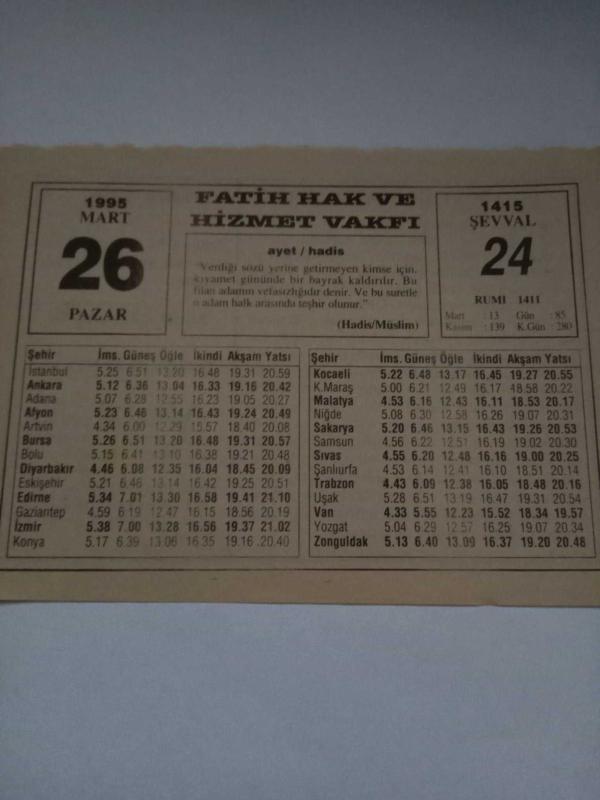 26 Mart 1995-Orijinal Takvim Yaprağı-Doğum Günü-Söz,Nişan,Nikâh,Düğün ve Önemli Günler Hediyesi-Fatih Hak ve Hizmet Vakfı-Ayet/Hadis(Hadis/Müslim)-İslam ve Sosyal Hayat-Sözün Özü-Yüzdeki Lekeler başlıklı ürün, Efemera, Müzik, Sinema > Belge ve Evraklar > Takvimler kategorisi altında İkinci El olarak satılmaktadır.