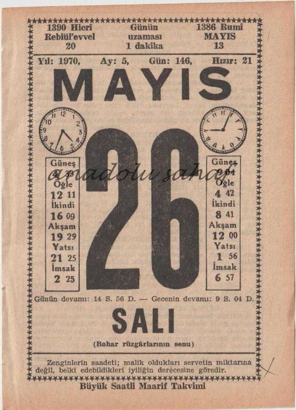 26 Mayıs 1970 / Büyük Saatli Maarif Takvimi
