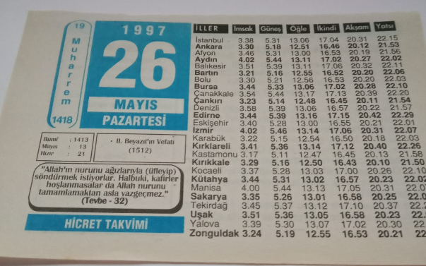 26 Mayıs 1997-Orijinal Takvim Yaprağı-Doğum Günü-Söz,Nişan,Nikâh,Düğün ve Önemli Günler Hediyesi-Hicret Takvimi-Ayet(Hadis)-(Tevbe-32)-II.Beyazıt'ın Vefatı(1512)-Devletin Başına Niçin Geçti?-Müfsit-Hz.Osman(r.a.), en son 23 gün önce güncellenmiştir.