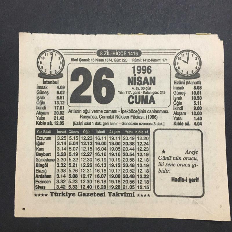 26 NİSAN 1996-TAKVİM YAPRAĞI-DOĞUM GÜNÜ HEDİYESİ-TÜRKİYE GAZETESİ TAKVİMİ,ARILARIN OĞUL VERME ZAMANI,İPEKBÖCEĞİNİN CANLANMASI ,RUSYADA ÇERNOVİL NÜKLEER FACİASI 1986,AREFE GÜNÜ VE GECESİ,TEKBİR İ TEŞRİK, en son bir ay önce güncellenmiştir.