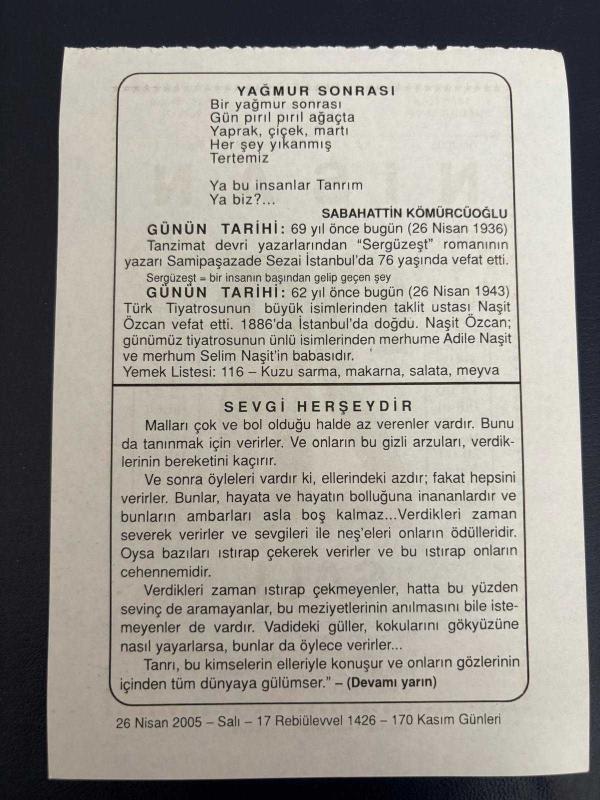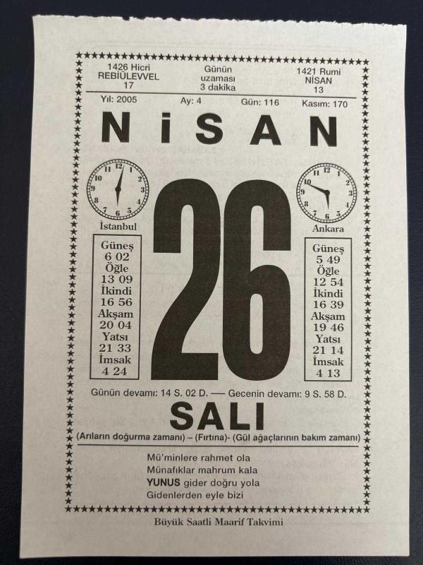 26 NİSAN 2005 - TAKVİM YAPRAĞI - DOĞUM GÜNÜ HEDİYESİ - BÜYÜK SAATLİ MAARİF TAKVİMİ - SABAHATTİN KÖMÜRCÜOĞLU - YAZAR SAMİPAŞAZADE SEZAİ VEFAT ETTİ - TİYATROCU NAŞİT ÖZCAN'IN VEFATI - SEVGİ HERŞEYDİR, en son 8 ay önce güncellenmiştir.