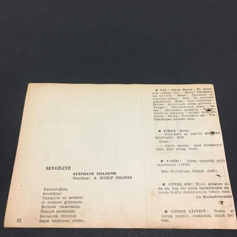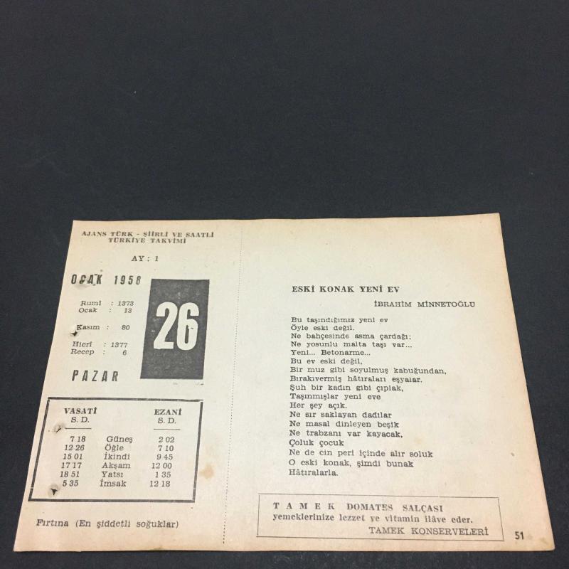26 OCAK 1958-TAKVİM YAPRAĞI-DOĞUM GÜNÜ HEDİYESİ-AJANS TÜRK-ŞİİRLİ VE SAATLİ TÜRKİYE TAKVİMİ,İBRAHİM MİNNETOĞLU,STEPHANE MALERME,FAL,FIKRA,TÜRK VENEDİK SULH MUAHEDESİ,1479,ŞAİR SURURİNİN ÖLÜMÜ 1561,GÜZEL SÖZ,YEMEK LİSTESİ başlıklı ürün, Efemera, Müzik, Sinema > Belge ve Evraklar > Takvimler kategorisi altında İkinci El olarak satılmaktadır.