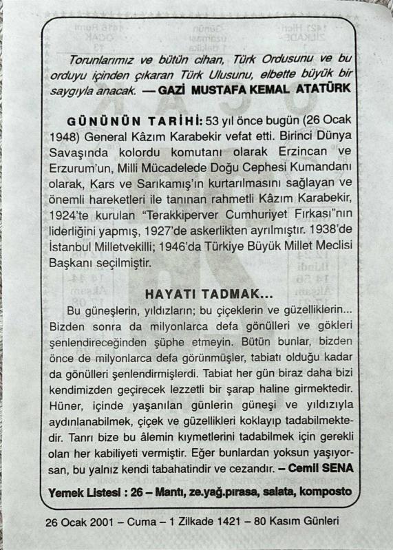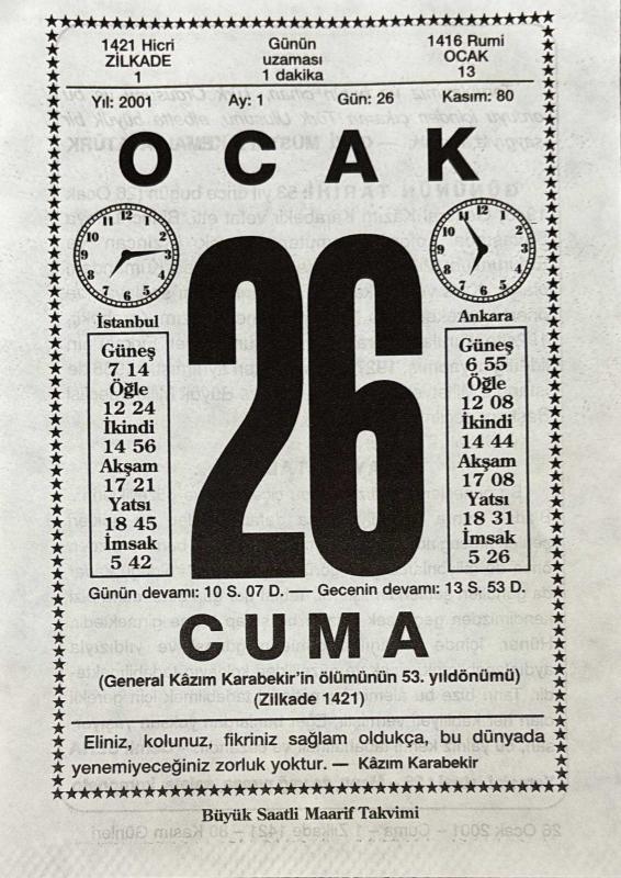 26 OCAK 2001 - TAKVİM YAPRAĞI - DOĞUM GÜNÜ HEDİYESİ - BÜYÜK SAATLİ MAARİF TAKVİMİ - KAZIM KARABEKİR - GAZİ MUSTAFA KEMAL ATATÜRK - CEMİL SENA, en son 8 ay önce güncellenmiştir.