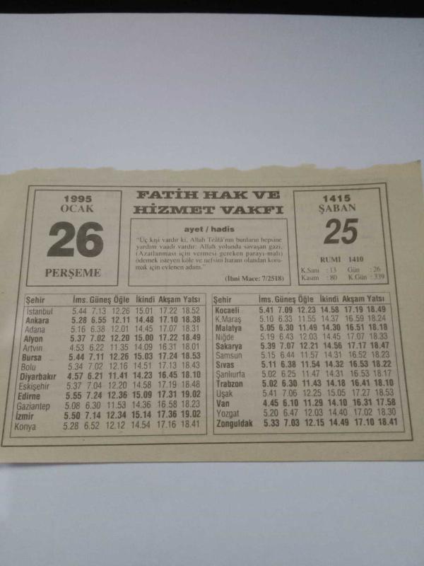 26 Ocak 1995-Orijinal Takvim Yaprağı-Doğum Günü-Söz,Nişan,Nikâh,Düğün ve Önemli Günler Hediyesi-Fatih Hak ve Hizmet Vakfı-Ayet/Hadis(İbni Mace:7/2518)-Milli Nizam Partisi'nin Kurucuları-Buhari/Dua:2140-Konuş-ma başlıklı ürün, Efemera, Müzik, Sinema > Belge ve Evraklar > Takvimler kategorisi altında İkinci El olarak satılmaktadır.