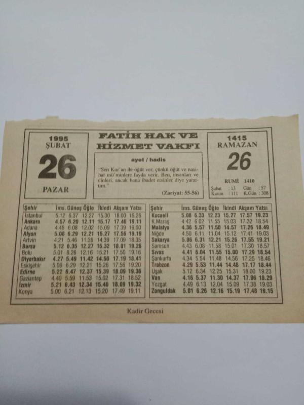 26 Şubat 1995-Orijinal Takvim Yaprağı-Doğum Günü-Söz,Nişan,Nikâh,Düğün ve Önemli Günler Hediyesi-Fatih Hak ve Hizmet Vakfı-Ayet/Hadis(Zariyat:55-56)-Bin Geceden Daha Hayırlı Kadir Gecesi-Sadi Şurazi-İsraftan Kaçının, en son 5 ay önce güncellenmiştir.