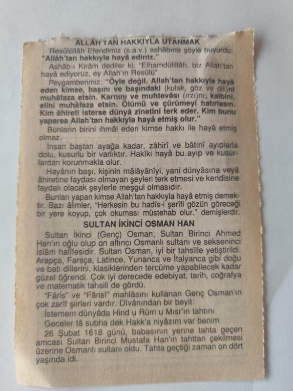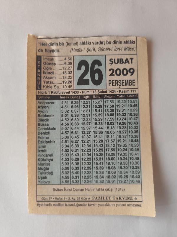 26 Şubat 2009-Orijinal Takvim Yaprağı-Doğum Günü-Söz,Nişan,Nikâh,Düğün ve Önemli Günler Hediyesi-Fazilet Takvimi-Ayet(Hadis)(Hadis-i Şerif, Sünen-i İbn-i Mace )-Sultan İkinci Osman Han'ın tahta çıkışı (1618)-Allahtan hakkıyla Utanmak-Sultan İkinci Osman Han başlıklı ürün, Efemera, Müzik, Sinema > Belge ve Evraklar > Takvimler kategorisi altında İkinci El olarak satılmaktadır.