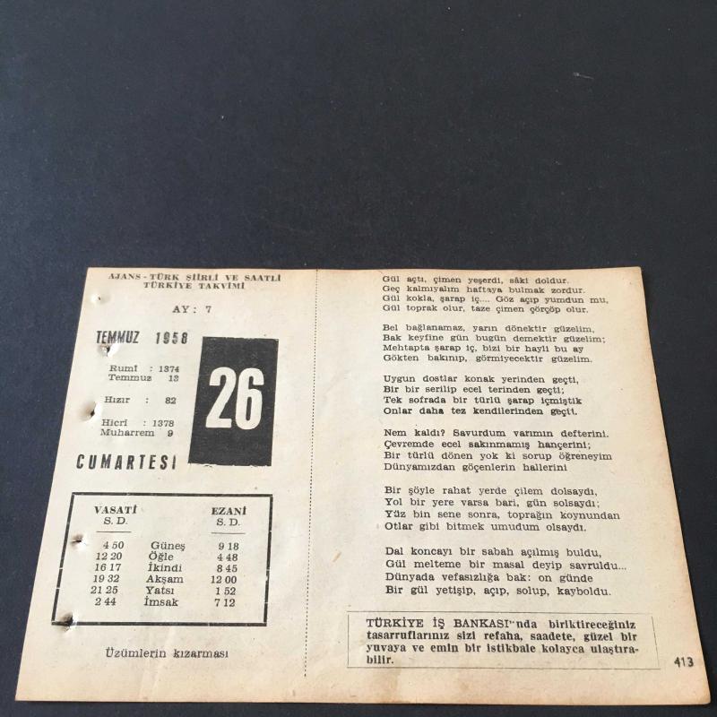 26 TEMMUZ 1958 -TAKVİM YAPRAĞI-DOĞUM GÜNÜ HEDİYESİ-AJANS-TÜRK ŞİİRLİ VE SAATLİ TÜRKİYE TAKVİMİ,FAL,FIKRA,SADRAZAM YAVUZ ALİ PAŞANIN ÖLÜMÜ,1604,TEMEŞVARIN FETHİ 1552,GÜZEL SÖZ,YEMEK LİSTESİ başlıklı ürün, Efemera, Müzik, Sinema > Belge ve Evraklar > Takvimler kategorisi altında İkinci El olarak satılmaktadır.