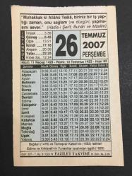 26 TEMMUZ 2007 -TAKVİM YAPRAĞI-DOĞUM GÜNÜ HEDİYESİ-FAZİLET TAKVİMİ,BOĞDAN 1476,TAMEŞVAR KALESİNİN 1552,FETİHLERİ,EDİRNE VE KIRKLARELİNİN YUNANLILAR TARAFINDAN İŞGALİ 1920,RECEB AYINDA KILINACAK NAMAZ