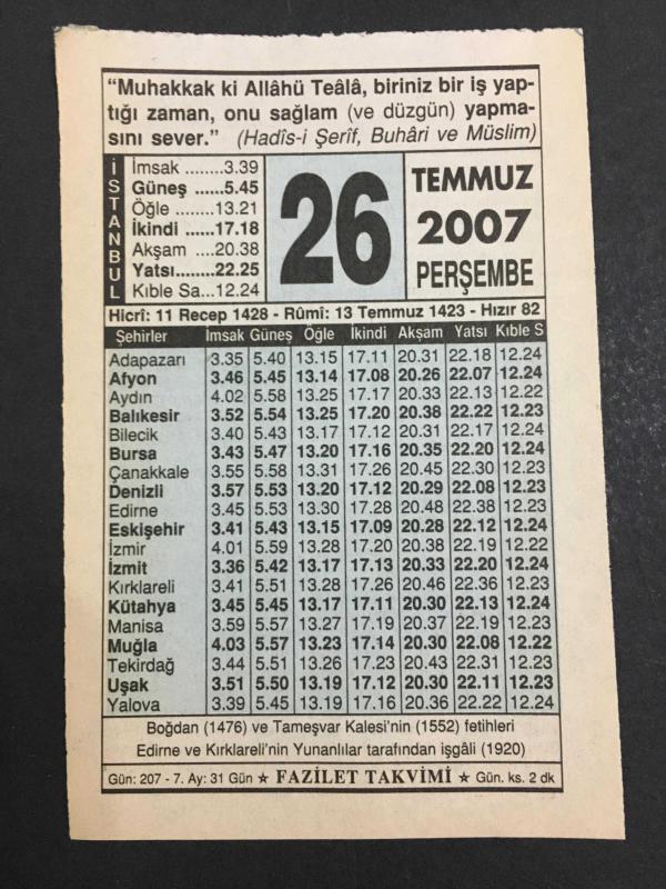 26 TEMMUZ 2007 -TAKVİM YAPRAĞI-DOĞUM GÜNÜ HEDİYESİ-FAZİLET TAKVİMİ,BOĞDAN 1476,TAMEŞVAR KALESİNİN 1552,FETİHLERİ,EDİRNE VE KIRKLARELİNİN YUNANLILAR TARAFINDAN İŞGALİ 1920,RECEB AYINDA KILINACAK NAMAZ, en son 8 ay önce güncellenmiştir.