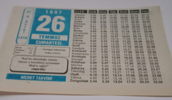 26 Temmuz 1997-Orijinal Takvim Yaprağı-Doğum Günü-Söz,Nişan,Nikâh,Düğün ve Önemli Günler Hediyesi-Hicret Takvimi-Ayet(Hadis)-(Nahl 98)-Estergon Kalesi'nin Fethi(1543)-İlim Üstündür-Selamlaşma-Hikmetler, en son 20 gün önce güncellenmiştir.