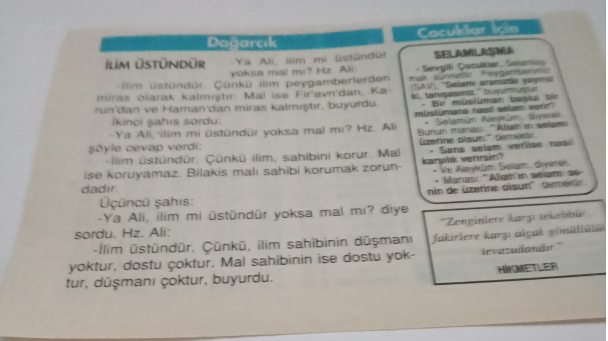 Kitapsız hayat kör,sağır,dilsiz yaşatmaktır.Kitap,zekayı kibarlaştırır.Kitaplar beni ortaya çıkardı.Milletlerin aklı,kitapla gelişir ve büyür.Kimler fazla okuyorsa,az okuyanlara hükmeder.Okumadan geçen bir gün,kaybedilmiş bir gündür.Söz uçar,yazı kalır.Yazı ile saptanmayan her şey,kaybolmuş demektir.Alem unutmuş,kalem (kitap) unutmamış.Bir kitabın içinde birçok ülkeler gezebilirsiniz.En iyi kitapları önceden okuyunuz,çünkü hepsini okuma fırsatını bulamayabilirsiniz.Bizde kitap baş üstünde taşınacak kadar makbuldur.Yazılı kağıdın üzerine basılmaz bile.”Hacı hacıyı Mekke’de,derviş dervişi tekkede bulur,demişler.Alim de alimi bizim çarşıda bulur.”Pirimiz Arslan Kaynardağ’dır,Nizamettin Aktuç’tur,Raif Yelkenci’dir.Gutemberg (1400-1468) matbaayı buldu.