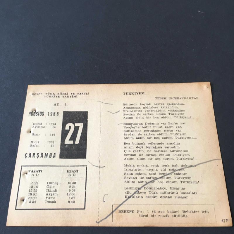 27 AĞUSTOS 1958 -TAKVİM YAPRAĞI-DOĞUM GÜNÜ HEDİYESİ-AJANS-TÜRK ŞİİRLİ VE SAATLİ TÜRKİYE TAKVİMİ,ÖZBEK İNCEBAYRAKTAR,FAL,FIKRA,AFYONUN YUNANLILARDAN TEMİZLENMESİ 1922,GÜZEL SÖZ,YEMEK LİSTESİ başlıklı ürün, Efemera, Müzik, Sinema > Belge ve Evraklar > Takvimler kategorisi altında İkinci El olarak satılmaktadır.
