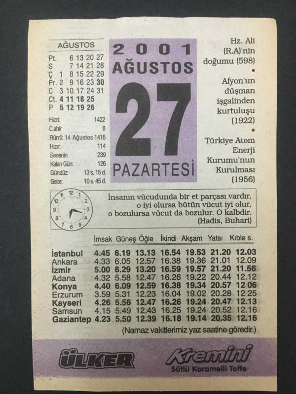 27 AĞUSTOS 2001-TAKVİM YAPRAĞI-DOĞUM GÜNÜ HEDİYESİ-ÜLKER TAKVİMİ,HZ ALİ RA DOĞUMU 598,AFYONUN DÜŞMAN İŞGALİNDEN KURTULUŞU 1922,TÜRKİYE ATOM ENEJİ KURUMUNUN KURULMASI 1956,EBUBEKİR RAZİ 850-920 başlıklı ürün, Efemera, Müzik, Sinema > Belge ve Evraklar > Takvimler kategorisi altında İkinci El olarak satılmaktadır.